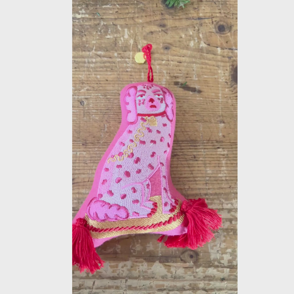 Our Posh Pink Dogs ornament features a pair of Willa Heart's irresistibly snooty Staffordshire-inspired pups. Based on the Willa Heart Buffy and Muffy painting, this limited-edition ornament is handcrafted from 100% merino wool, with our favorite pair of opinionated pooches embroidered on both sides in shades of pink, red, and gold. While they may appear to be identical mirror images at first glance, look closer: the dog facing right is Buffy, and the one facing left is Muffy (who insists she's the prettiest). These girls are rich in opinions and are always ready to spill the tea.