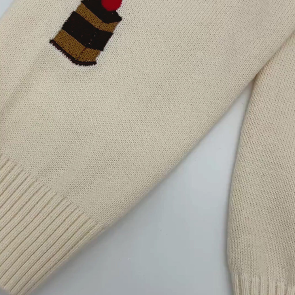 Our Very Hungry Caterpillar Sweater celebrates Eric Carle's distinctive collage style through a combination of knitting artistry and tactile embroidery that captures the same energy as the original illustrations.